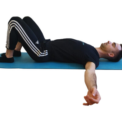 - Vrid långsamt ena höften bakåt så att knäet följer med och bäckenet roterar på den sidan.