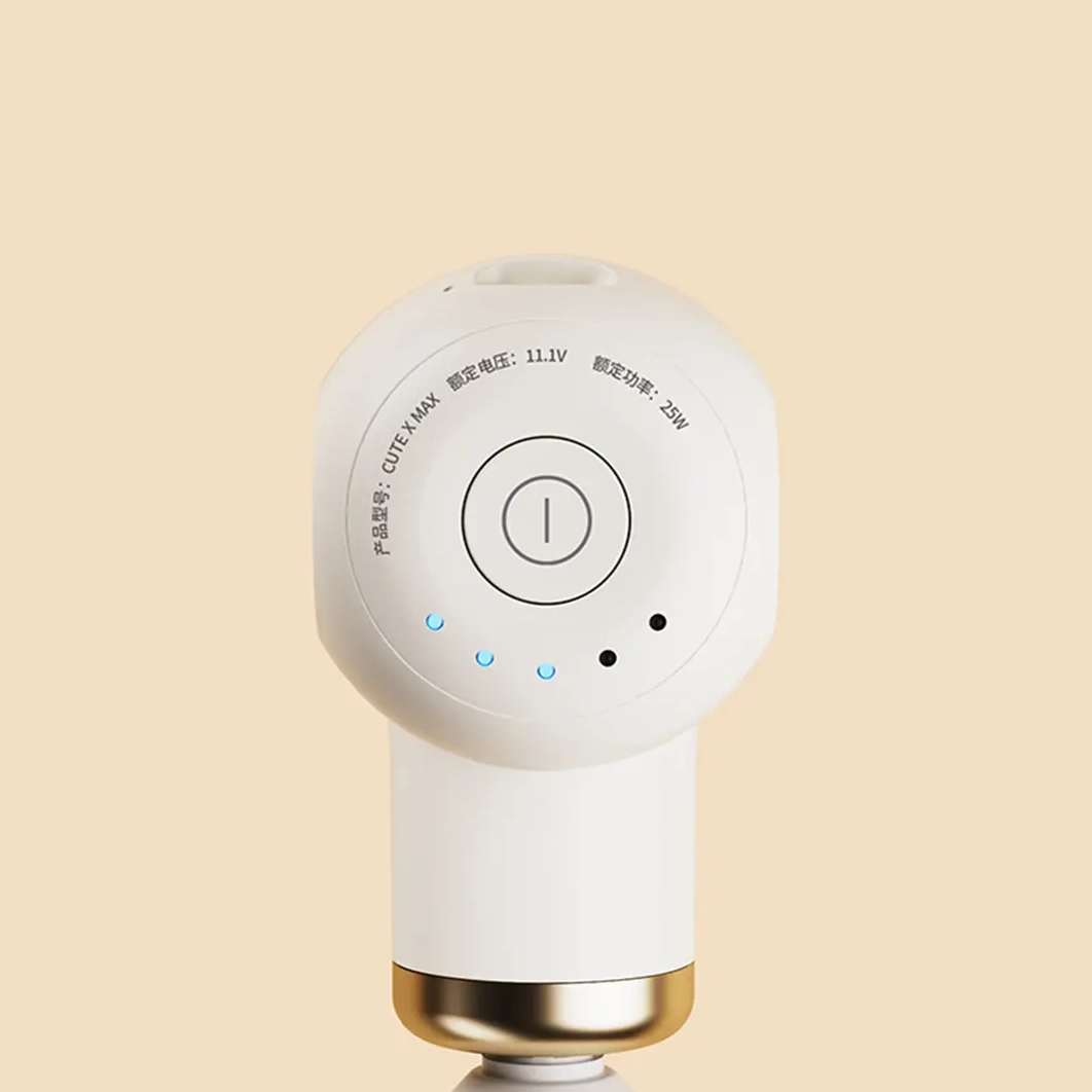 Tyst, kraftfull och multikompetent mini-massagepistol av hög kvalitet. Variabel slaglängd 4–10 mm, hastighet mellan 800-3000 rpm, 13 kg stall force samt 5 munstycken; metall till supermjuk, för både mjuk och djup massage – perfekt för att behandla allt från huvud, nacke, käke till senor och stora muskler – hemma och på resan.